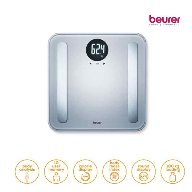 Esta elegante báscula diagnóstica de vidrio cuenta con una innovadora pantalla LCD redonda. Incorpora electrodos de acero inoxidable y vidrio de seguridad. Podrás visualizar los valores de peso, grasa corporal, agua corporal, masa muscular, masa ósea y calorías tocando los botones táctiles que se encuentran debajo de la pantalla. La báscula se enciende automáticamente y comienza a realizar la medición cuando el usuario se coloca sobre ella.